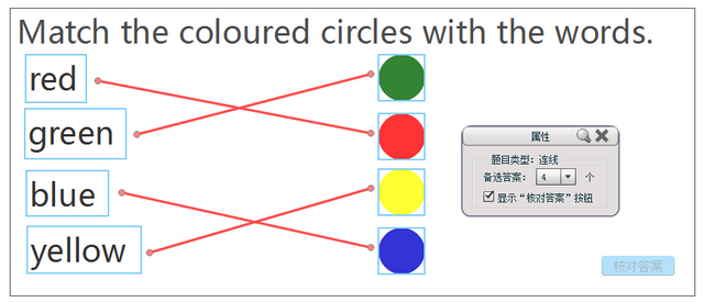 4.设置属性:在属性框中可设置备选答案的个数和是否显示『核对答案』按钮。若设置显示『核对答案』按钮,在讲授状态下答题后,可判断对错。(注:在讲授状态下答题时,至少连出一条线,才可以点击『核对答案』按钮判断答案正误。)